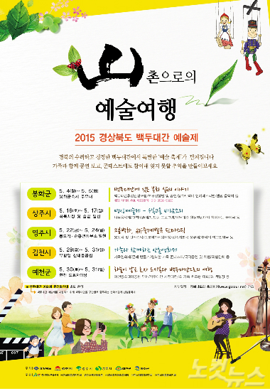 경상북도와 경상북도관광공사는 5월 경북 김천, 영주, 상주, 예천, 봉화 5개 시․군에서 ‘산촌으로의 예술여행’이라는 백두대간 예술제를 개최한다.