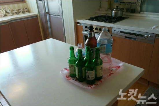 일가족 5명이 숨진 채 발견된 부산 한 아파트 주방에 빈 술병이 남아 있다. (사진=해운대경찰서)