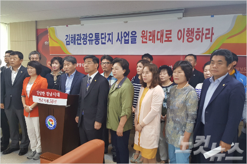 장유지역 주민자치위원회와 통장협의회 등 60여 개 시민사회단체 대표와 8명의 김해지역 시·도의원은 15일 경남도청 프레스센터에서 기자회견을 열고 롯데의 김해관광유통단지 계획변경을 반대하고 원래대로 시행할 것을 주장했다.