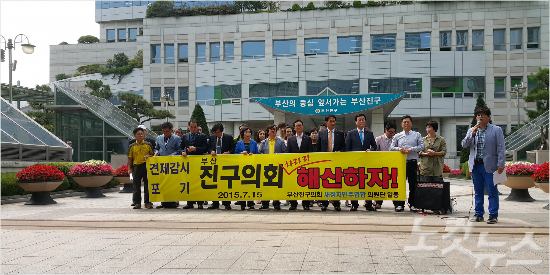 부산진구의회 배용준 의원 등 새정치민주연합 소속 의원 7명은 15일 오전 의회 앞에서 기자회견을 열고 "견제와 감시 역할을 포기한 채 구청장의 거수기로 전락한 구의회를 해산하자"고 밝혔다.