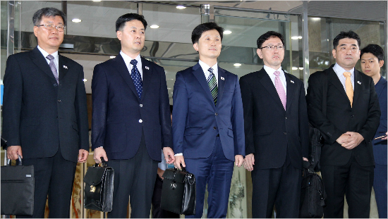 이상민(가운데) 통일부 남북협력지구발전기획단장을 위원장으로 하는 개성공단 남북공동위원회 남측대표단이 16일 오전 제6차 개성공단 공동위원회 회담에 참석하기 위해 서울 종로구 남북회담본부를 나서고 있다. (박종민 기자)