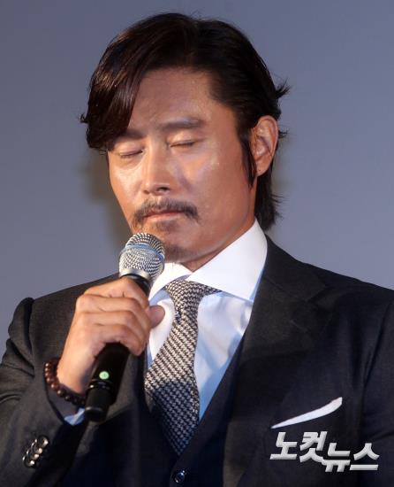 배우 이병헌이 24일 오전 서울 자양동 롯데시네마 건대입구에서 열린 영화 ‘협녀, 칼의 기억’ 제작보고회에 참석해 50억 협박 사건과 관련해 심경을 밝히고 있다.