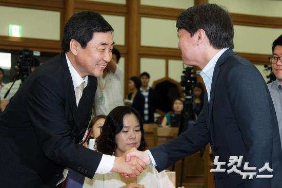 30일 오전 국회 의원회관에서 열린 '국정원 해킹 사태 해결을 위한 토론 및 백신프로그램 발표회에 새정치민주연합 이종걸 원내대표(좌측)와 안철수 국민정보지키기위원장이 인사를 하고 있다.