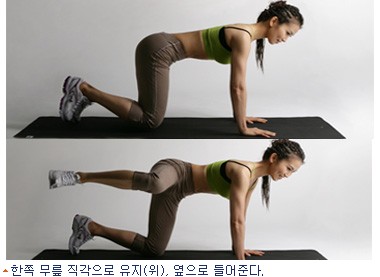 -엉덩이 옆쪽이 수축되도록 하여, 잠깐 멈추었다가 천천히 준비 자세로 돌아간다.