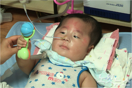 ◇ 첫 아이의 탄생, 알 수 없는 병과의 사투산소호흡기를 단 채 하루 종일 누워서 생활하고 있는 민욱이(1세).