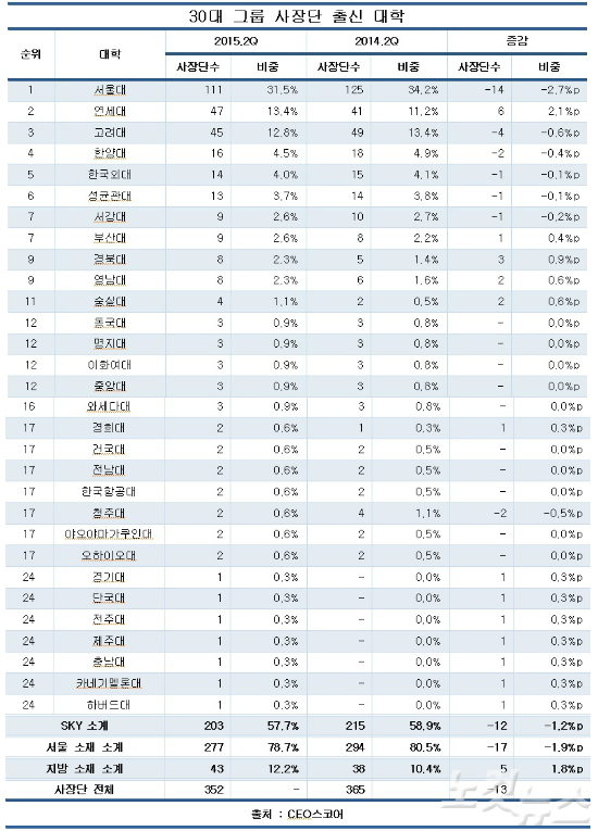서울대와 고려대 출신이 각각 14명, 4명 줄어든 반면 연세대는 6명이 늘어 약진해 SKY 순위도 작년 서울대→고려대→연세대에서 서울대→연세대→고려대로 바뀌었고 SKY비중도 작년 58.9%→57.7%로 소폭 떨어졌다.