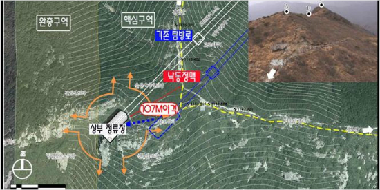 신불산 케이블카 상부정류장이 낙동정맥 핵심구역 안에 자리잡고 있어, 환경부 가이드라인을 어겼다는 논란이 제기돼 왔다. (자료=새정치민주연합 이인영 의원 국감자료)