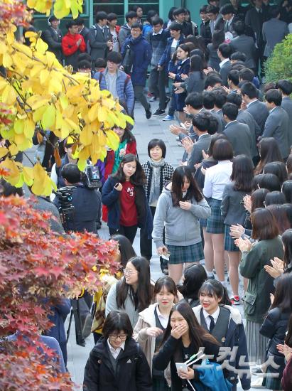 2016학년도 대학수학능력시험을 하루 앞둔 수험생들이 11일 오전 서울 서초구 서초고등학교에서 선생님들과 후배들의 응원을 받으며 하교하고 있다.