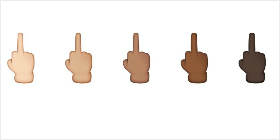 애플이 아이폰 iOS 9.1 정식 업데이트 버전에 추가한 '손가락 욕' 이모티콘. 피부색은 인종에 따라 여섯 가지다