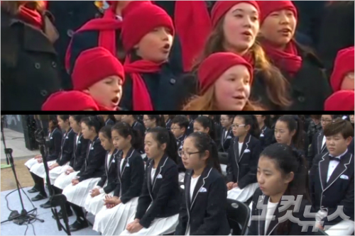 축가를 부르기 위해 참석한 샌프란시스코 소년소녀합창단은 코트와 모자, 목도리로 꽁꽁 싸맨 채 무대 위에 섰습니다.