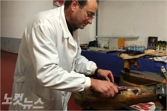 하몽 마에스트로(장인)가 관광객들을 위해 직접 하몽을 잘라주고 있다. (사진=조은정 기자)
