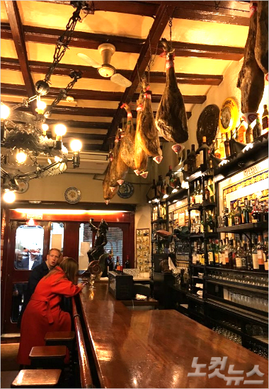 스페인의 여느 식당에서 흔히 볼 수 있는 하몽은 현지인들이 신성시할 정도로 자부심이 대단하다. 하몽이 한 식당의 천정에 걸려 있다. (사진=조은정 기자)
