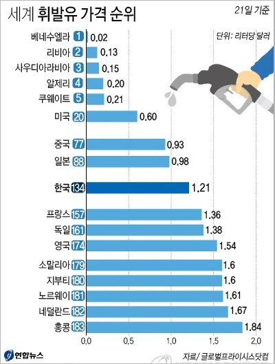 이밖에 석유생산국인 러시아(0.52달러)와 미국(0.60달러)도 휘발유 가격이 싼 20개국 안에 들었다.
