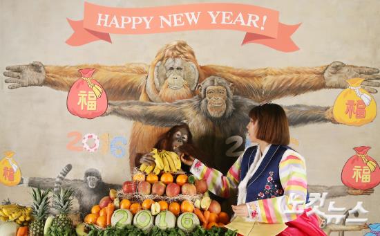 2016년 병신년(丙申年)을 앞둔 28일 경기도 용인시 에버랜드 동물원에서 아기 오랑우탄 두리에게 새해를 맞아 신선한 과일과 채소를 선물하고 있다.