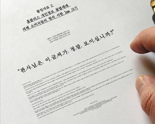 이에 시민단체들은 1㎜의 작은 글씨로 쓴 글을 소비자들이 실제로 읽기에 무리가 있다고 비판하면서 "판사님은 이 글씨가 정말 보이십니까?"라고 되묻는 내용을 서한에 담았다.