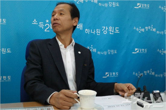 14일 기자간담회에서 기자들의 질문을 듣고 있는 최문순 강원도지사.(사진=강원CBS 박정민 기자)