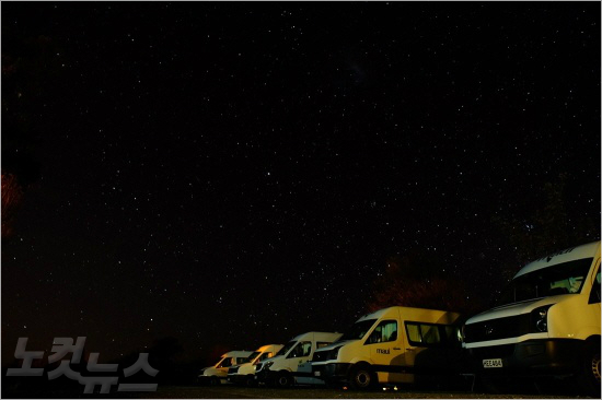 별이 가득한 뉴질랜드 남섬의 밤하늘 아래로 캠퍼밴들이 줄지어 있다. (사진=링켄리브 제공)