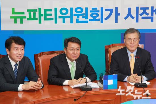 21일 오전 국회에서 열린 더불어민주당 뉴파티특별위원회 출범 회의에서 이철희 두문정치연구소장(가운데)이 인사말을 하고 있다.