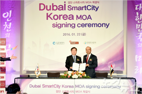 인천시와 아랍에미리트(UAE) 두바이 국영기업인 '두바이 스마트시티社'는 22일 인천 송도쉐라톤호텔에서 '스마트시티'를 조성하기 위한 합의각서(MOA)를 체결했다.