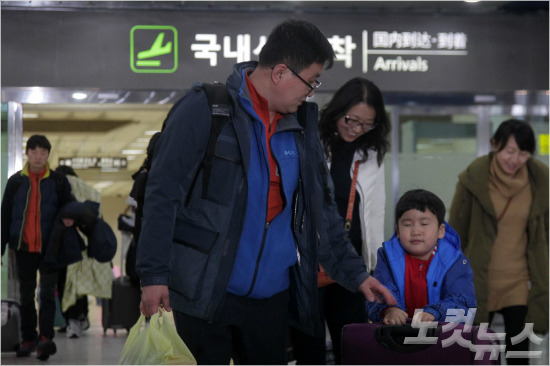 32년 만에 폭설로 폐쇄된 제주국제공항의 항공기 운항이 재개된 25일 오후 제주도에 고립됐던 여행객들이 서울 김포공항에 도착하고 있다. (사진=박종민기자)