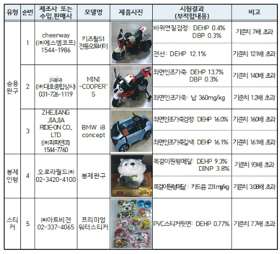 소비자원의 분석결과에 따르면 5개 제품에서 내분비계 장애물질인 프탈레이트 가소제가 허용기준(함유량 0.1% 이하)을 최대 452배 초과해 검출됐다.