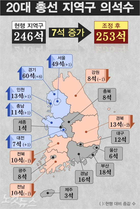 수도권은 10석 순증하게 됐다. 서울과 인천이 각각 한 개씩, 경기는 8개가 늘어난다.