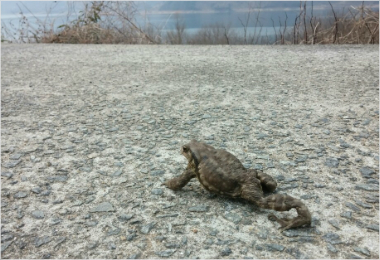 ◆ 박수완> 두꺼비들이 많이 로드킬을 당하고 있어요. 그 도로에서. 두꺼비들이 보통 살아가는 건 서식지는 산이에요. 산란철에 산란을 위해서 겨울잠을 자고 일어난 두꺼비들이 자신이 태어난 산란처로 또 이동을 하거든요. 마치 은어가 회귀본능으로 다시 태어난 곳으로 돌아가는 것처럼.