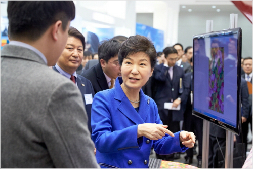 박근혜 대통령이 지난 10일 오전 대구 엑스코에서 열린 2016 대구 국제섬유박람회에서 전시관을 둘러보고 있다. (사진=청와대 제공)