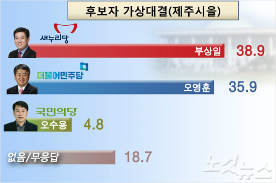 제주시 을 선거구 지지도 조사에서 새누리당 부상일 후보는 38.9%였고 더민주 오영훈 후보는 35.9%의 지지율을 보였다. 불과 3%P차의 살얼음 승부다.