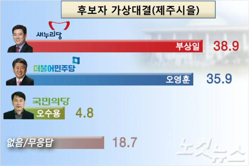 어느 후보를 지지할지 물은 결과 새누리당 부상일(45) 후보는 38.9%, 오영훈(48) 더불어민주당 후보는 35.9%의 지지율을 보였다.