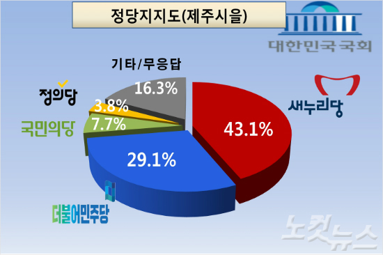 제주시 을 선거구의 정당 지지도는 새누리당이 43.1%, 더불어민주당 29.1%, 국민의당 7.7%, 정의당 3.8% 순이었다. 무당층은 14.8%였다.