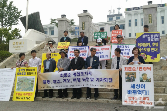 강원기독교교회협의회(이하 '강원NCC')는 26일 강원도청 앞에서 '설악산 케이블카 반대 1인 시위 성직자 폭행에 대한 최문순 강원도지사 규탄' 성명을 발표했다.