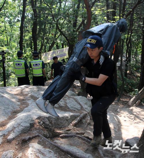 '수락산 등산로 살인사건' 현장검증을 앞두고 경찰 관계자가 3일 오전 서울 수락산 사건현장으로 마네킹을 옮기고 있다.