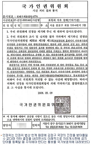 이에 대해 인권위는 인권위 법상 한계 때문에 김 국장의 진정을 받아들일 수 없다며 각하 결정을 내리면서도 이례적으로 자유게시판에 금지단어를 등록할 때 주의해야 한다는 통보를 국가보훈처에 내려 보냈다.