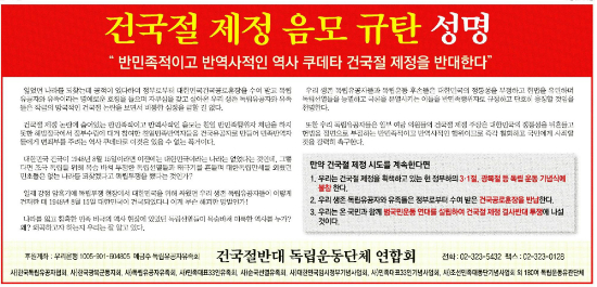 한국독립유공자협회 등 독립운동 관련 180개 단체가 결집한 '건국절반대 독립운동단체 연합회'는 6일 한 언론사 광고를 통해 '건국절 제정 음모 규탄' 성명을 냈다.