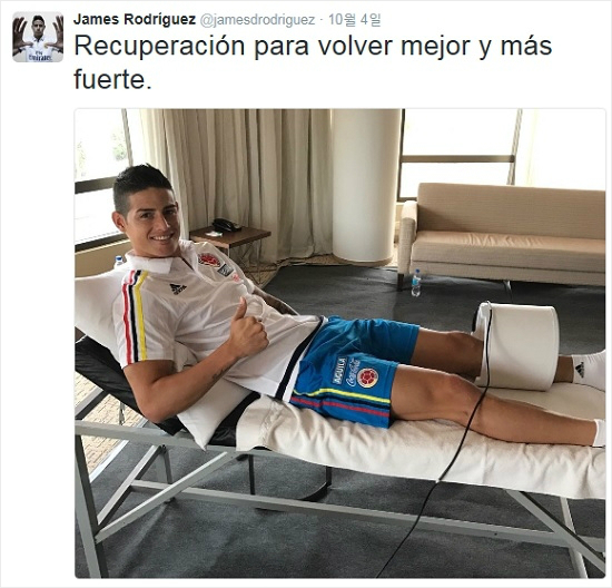 콜롬비아의 간판스타 하메스 로드리게스는 종아리 부상 상태로 대표팀에 소집됐지만 회복이 더딘 탓에 결국 소속팀 복귀를 결정했다. 그러자 현지 과걱 팬으로부터 가족을 살해하겠다는 위협을 받았다.(사진=하메스 로드리게스 공식 트위터 갈무리)
