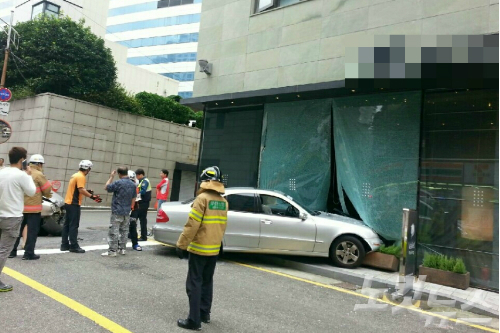11일 오전 11시 30분쯤 부산 해운대구의 한 사거리에서 A(23·여)씨가 몰던 벤츠 차량이 B(61)씨의 카렌스 차량과 부딪친 뒤 곧바로 근처의 한 호텔 건물 1층으로 돌진했다.