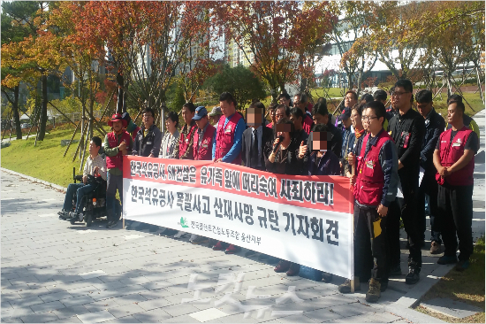 전국플랜트건설노조 울산지부와 폭발사고 사망자 유가족은 17일 오후 한국석유공사 본사 앞에서 사고규탄 기자회견을 열었다.