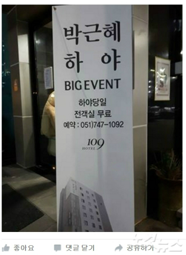 부산의 한 비즈니스호텔이 '박근혜 대통령이 하야하는 당일 숙박요금을 받지 않겠다'라는 이벤트를 내걸었다.