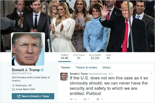 자신에게 부정적인 언론매체를 '가짜뉴스'라고 매도하며 트위터를 대중과 직접 소통하는 수단으로 삼아왔던 도널드 트럼프 미국 대통령이 자신의 트위터 발언 때문에 반 이민 행정명령을 둘러싼 소송에서 불리한 입장에 몰릴 것으로 보인다.