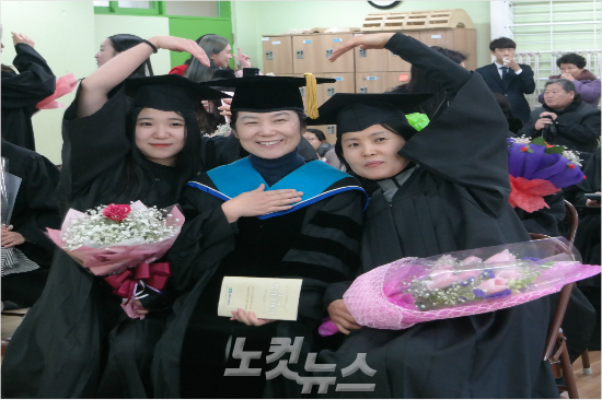 춘해보건대학교 제47회 학위수여식이 10일 오전 학교 대강당에서 열렸다. 모녀지간인 남영희 씨와 임혜진 씨가 함께 졸업식을 하고 기념촬영을 하고 있다. 사진 왼쪽부터 임혜진 씨, 요가과 곽미자 교수, 남영희 씨.(사진 = 춘해보건대학교 제공)