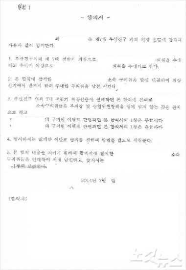 여당 의원들은 선거를 하기 전 특정 후보를 의장으로 추대하기 위해 합의서를 만들었다. (사진=부산경찰청 제공)