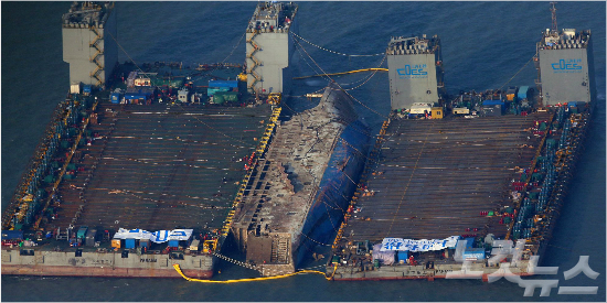 한편 이날 오전 11시 10분쯤 세월호 선체를 당초 목표치인 수면 위 13미터까지 끌어올리는데 성공했다.