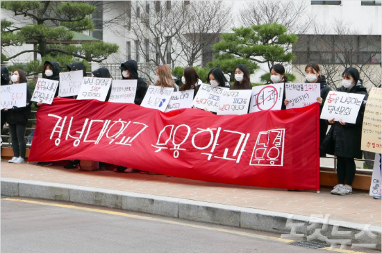 학교 측의 폐과 결정에 반발해 집회를 벌이는 경성대학교 재학생들.(사진=송호재 기자)