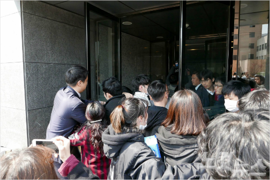 28일 부산 경성대학교가 무용학과 등 4개 학과 폐지안을 재심의를 앞두고 학생과 학부모 등 관계자의 회의장 건물 진입을 막아서며 충돌이 일어났다. (사진=송호재 기자)