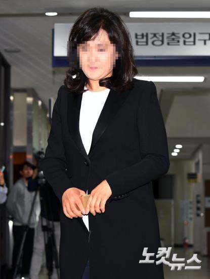 우병우 전 청와대 민정수석의 부인인 '정강' 대표 이모 씨가 16일 오전 서울 서초구 서울중앙지법에서 열린 업무상 배임 혐의와 관련한 1차 공판에 출석하고 있다.