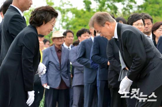 문재인 대통령이 23일 오후 경남 김해시 진영읍 봉하마을에서 열린 노무현 대통령 서거 8주기 추도식에 참석해 권양숙 여사와 인사를 하고 있다. <사진공동취재단>사진공동취재단>