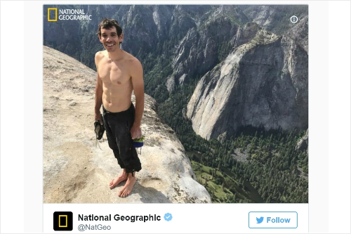 3일(현지시간) 내셔널지오그래픽 등에 따르면, 호놀드는 이날 새벽 5시 32분 엘 카피탄 등반을 시작해 3시간 56분 후인 오전 9시 28분 모래로 뒤덮인 정상에 올랐다. 등반 전 오트밀과 아마, 치아 씨앗, 블루베리로 간단히 아침 식사를 했다.