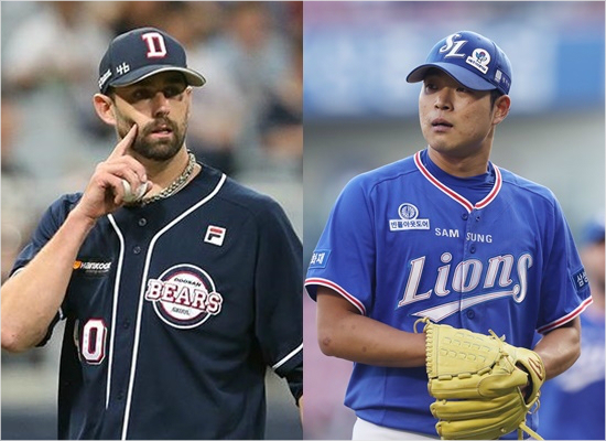 8일 잠실 경기에서 선발 대결을 펼친 두산 더스틴 니퍼트(왼쪽)와 삼성 안성무.(사진=두산, 삼성)