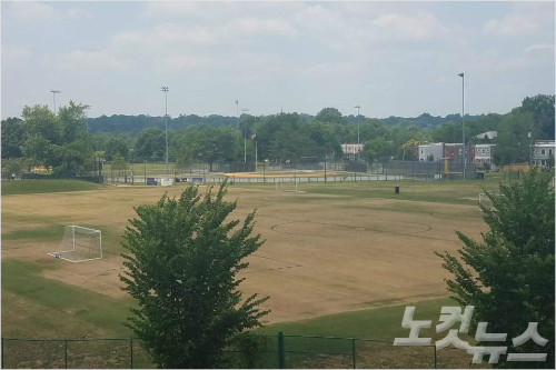 14일(현지시간) 미 하원 공화당 원내총무 스컬리스 의원이 피격을 당한 미국 버지니아 주(州) 알렉산더의 유진 심슨 스타디움 파크. 사건 직후 현장이 폐쇄돼 적막감이 감돌고 있다. (장규석 워싱턴 특파원)